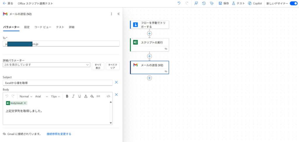 - 動的なコンテンツの利用: 「スクリプトを実行」アクションの後に「新しいステップ」を追加し、例えば「メール通知を送信する (V3)」アクションなどを設定します。